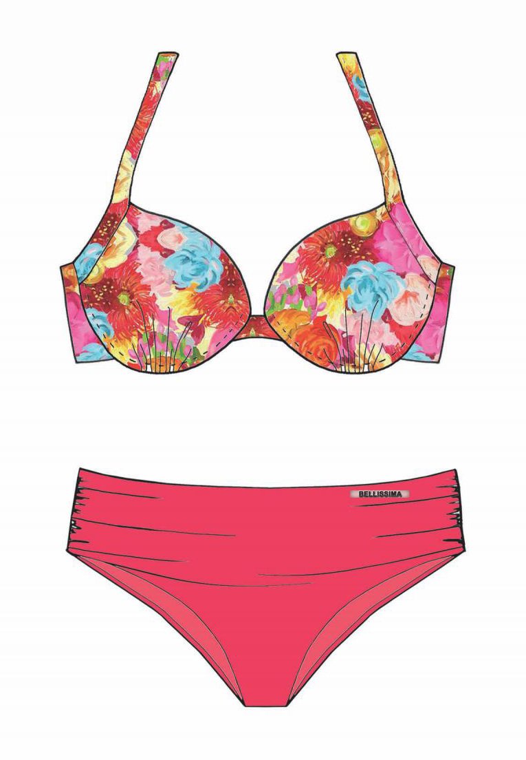 Dvodelni kupaći kostim u rozoj boji i sa cvetnim dezenom u kojem ćete uvek izgledati ženstveno. Korpe su penaste, sa fišbajnom i sa bretelama koje se vezuju. Donji deo je klasičan i dublji slip.