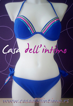 Bikini u plavoj boji sa penastim korpama koje su ojačane fišbajnom i blagim punjenjem. Grudnjak kostima je na vezivanje. Donji deo kupaćeg kostima je brazilijana na vezivanje.