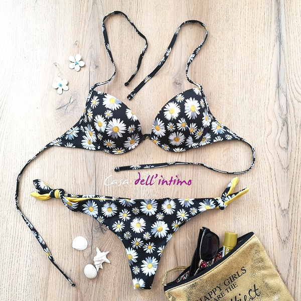 Bikini sa penastim korpama sa žicom i blagim punjenjem. Grudnjak kostima je na vezivanje. Donji deo kupaćeg kostima je brazilijana na vezivanje. Uradjena je sa dva lica, tako da imate jednu šarenu stranu i drugu jednobojnu žutu.