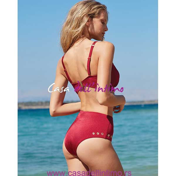 Kupaći iz dva dela u bordo boji. Donji deo kupaćeg su duboke gaćice koje nisu mnogo sečene pozadi, Gornji deo je radjen sa čvrstim korpama ojačanim žicom. Zakopčava se na kopču.