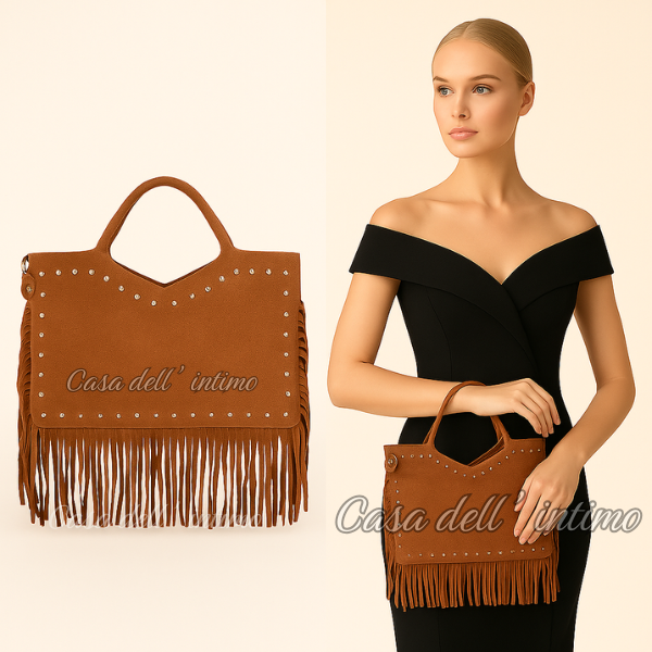 Ženska kožna torba sa resama od kvalitetne velur kože. Ima prostranu unutrašnjost sa jednom manjom pregradom, dve ručke i odvojivi kaiš. Poseduje i manju pregradu spolja. Zatvara se na rajsfešlus.