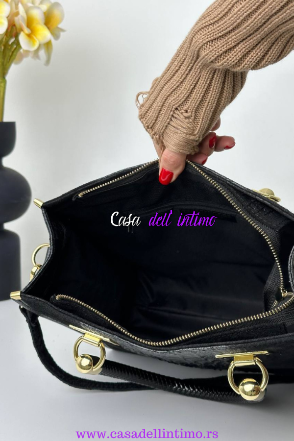 Elegantna ženska torba od prirodne kože. Torba ima glavni pretinac, sa unutrašnjim džepom koji se zatvara na rajsfešlus i sa još dva džepa bez rajsfešlusa.