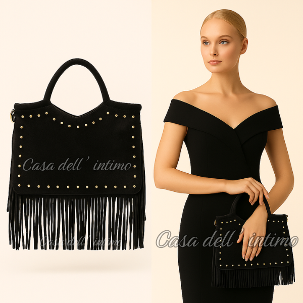 Ženska kožna torba sa resama od kvalitetne velur kože. Ima prostranu unutrašnjost sa jednom manjom pregradom, dve ručke i odvojivi kaiš. Poseduje i manju pregradu spolja. Zatvara se na rajsfešlus.